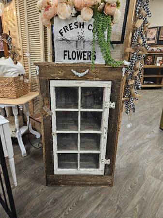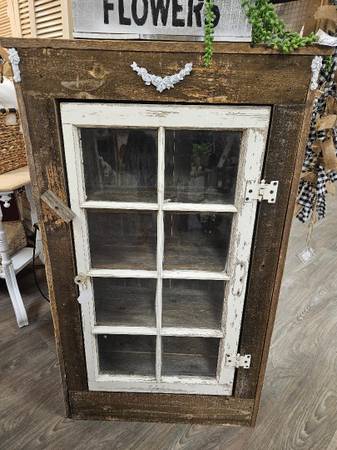 Vintage barn wood farmhouse primitive cabinet with vintage glass pane window for door and decorative ornamental molding and glass knob pull. on Sale! This is newly built and has 4 shelves inside cabinet. Measures approx. 27" wide by 12" deep by 41" tall. To make this easy to see and purchase this can be seen and purchased at American Mercantile in OO La La booth R4N which is down the first aisle to the left at the end of that aisle or the store might have moved it up into one of the front showrooms. Please ask sales staff for help to find. American Mercantile is located at: 1314 Court St, Medford, OR 97501 OPEN Tuesdays thru Saturdays 10am 5pm