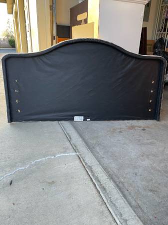 Nice linen type cloth tufted queen headboard (will work with double too). Very heavy. Last picture is the posts and hardware to attach to a frame, is adjustable to several heights, nice hardwood so makes it very sturdy. Cash only. Call or text is best Kristine 5three0-210-seven8two7