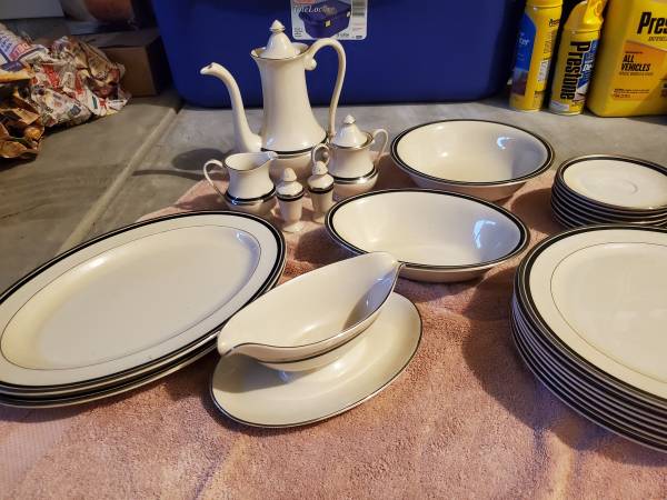 Dinnerware/China(made by Edgerton made in Usa)Service for 8 with serving pieces that include,8 of each..dinner plate,bread dish,cup and saucer,also includescoffee pot,2 large serving platters,2 serving bowls(1 round,1 oval) creamer and sugar bowl,gravy boat,salt and pepper shakers..set used twice(basically was on display in a China cabinet)no chips or cracks..stemware in some pics are not included,pick up off sw g street grants pass(pd over $1200,taking up space and would like someone to get use out of it)