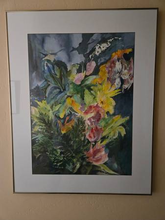 Gorgeous Floral water color, beautifully framed. Large painting to set the tone for the whole room with its vibrant colors that go with any decor. Measures 30 inches wide and 38 inches high.