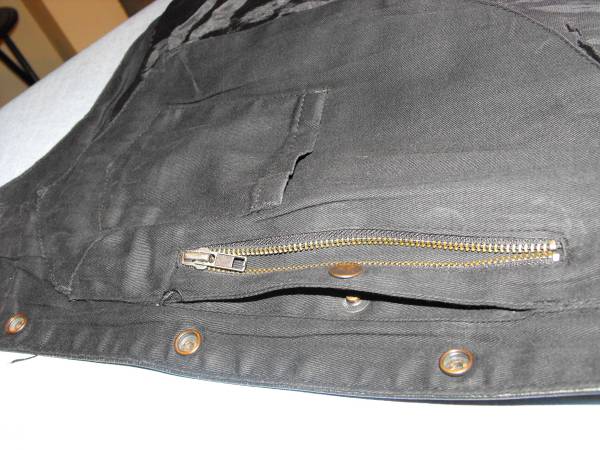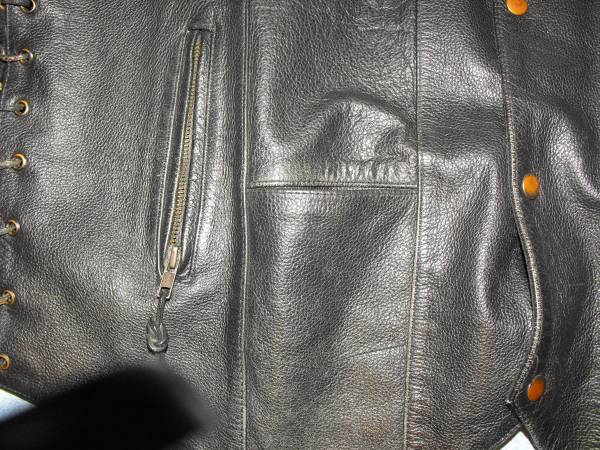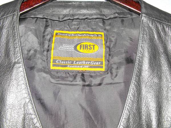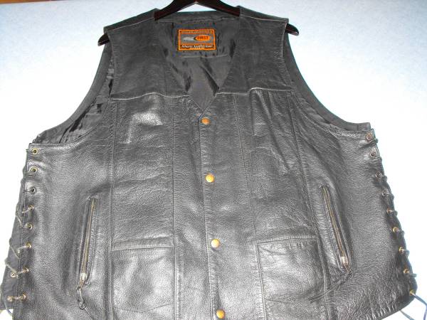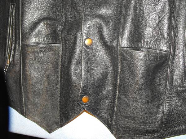 A Black Leather Vest with no wear indications or marks. Two small front open type pockets and two side zippered pockets on outside of each side of vest, and three pockets and the same design pattern on the inside of the vest with a additional snap side pockets for a total of ten pockets.