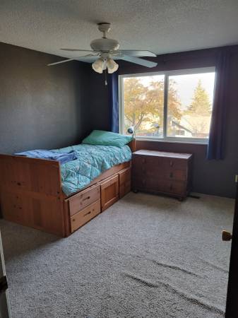 The room offers a large closet and a window facing the beautiful hills on our very quiet street. I have a single bed, small dresser and computer table that you can use. Or you can provide your own furnishings. There is potential for garage space for storage. There is also on site parking. You will be paying 1/3 of the utilities, trash and wi-fi bills(between $100- $175) first months rent and a $650 refundable security deposit. Great location on the south side of town. Walking distance to grocery stores and hiking trails. Shared bathroom and kitchen.