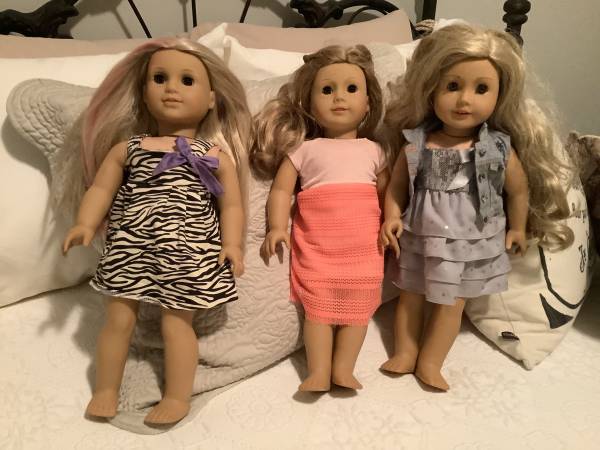 I have three American Girl Dolls. These are regular size, Not the mini. All in very nice condition. See pictures. Your choice for $50. Each. Please call or text, my email is Not working. 541-660-4one50